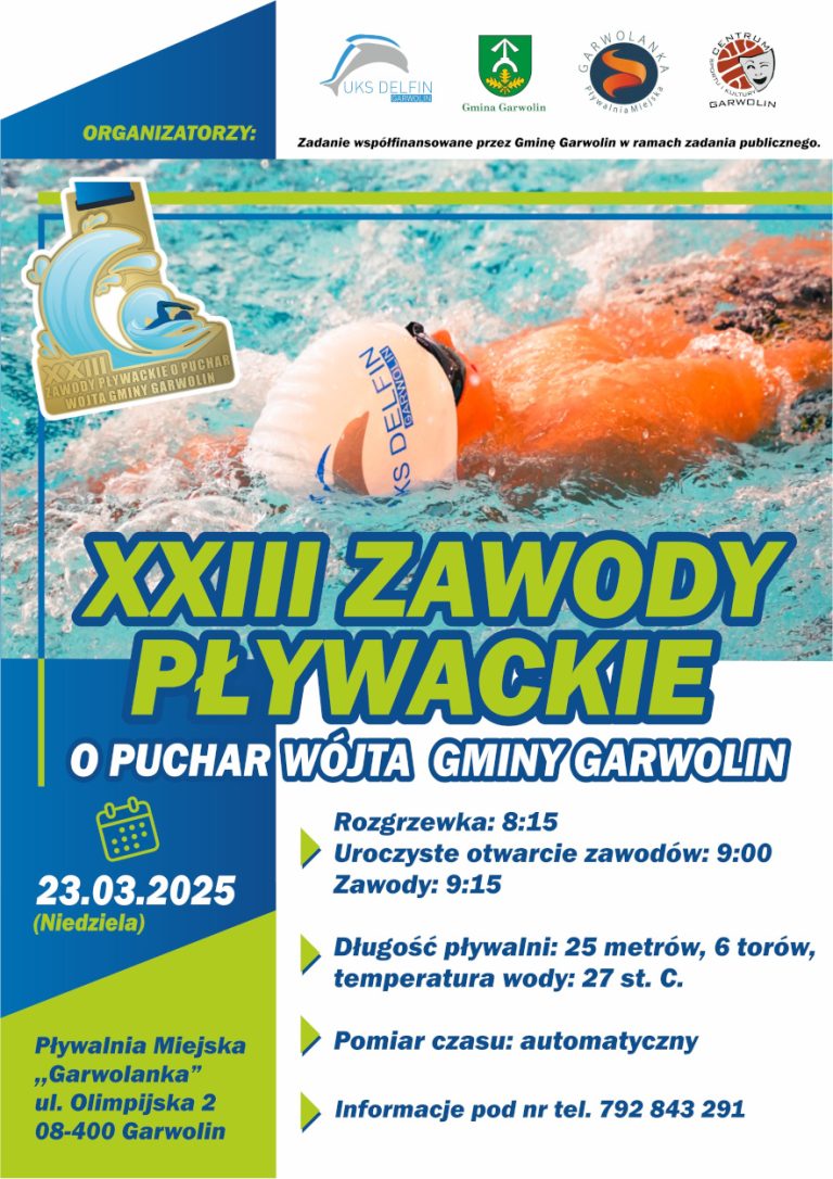 Serdecznie zapraszamy na XXIII otwarte Zawody Pływackie o Puchar Wójta Gminy Garwolin Marcina Kołodziejczyka, które odbędą się na Pływalni Miejskiej „GARWOLANKA” w Garwolinie.